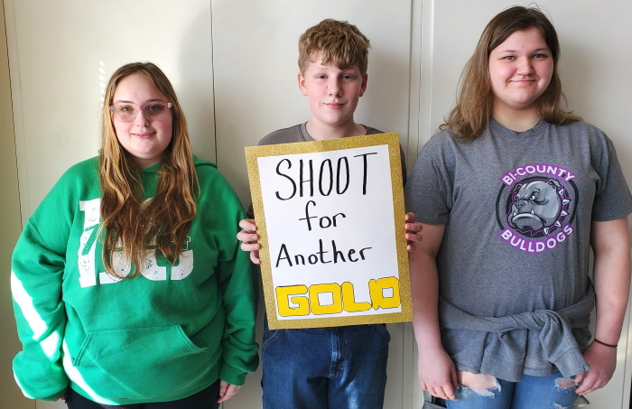 Before the departure, Hoffman (left) and Schaefer stood with Daniel Seilhymer, who held a sign for athletes who would compete in basic Basketball Skills (Dribbling, Passing, and Shooting.) They include Marshall Armstrong, Katie Bidwell, Lucy Kurtz, and Dakota Stotler.